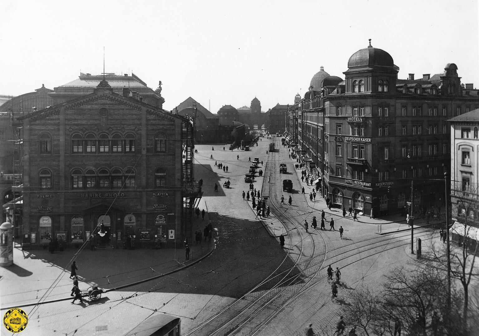 Für die Dachauerstraße (bzw. damals tlw. noch ein Teil der Schützenstraße) sind wir, meine ich, eigentlich schon zu weit westlich. Vor allem dürfte das helle Gebäude auf Höhe des Bahnhofs auf diesem Bild rechts am Rand ziemlich sicher das frühere "Hotel Kaiser" sein.